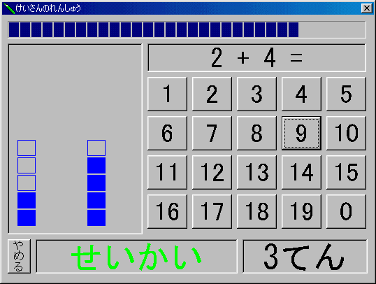 小学1〜2年の数と計算の練習プログラムです。短時間でも良いので、集中して回答する練習が出来るように、工夫しています。 |
