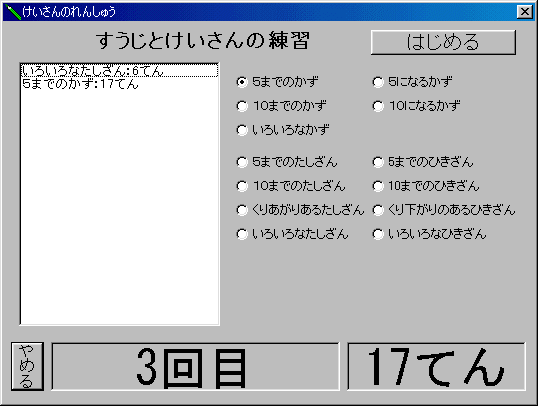 プログラムが始めると、この画面が表示されます。 やりたい問題を選びます。それぞれの問題は、難易度別に分けてあります。 始めてすぐには、本当は表示されませんが、右の欄には、今日挑戦した問題とその得点が表示されます。 |