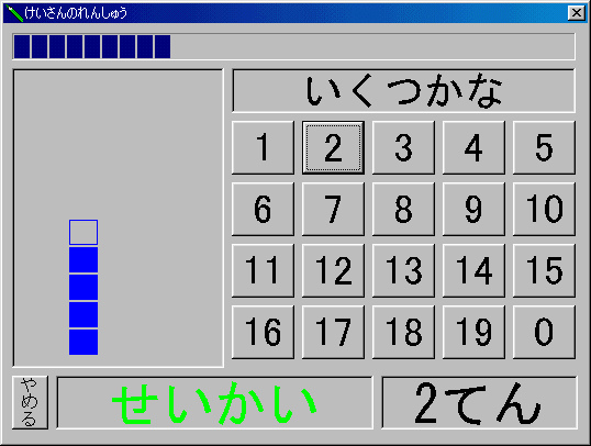 小学一年生〜2年生にかけて使える、計算練習のプログラムを作りました。 画面に現れた「タイル」の個数を、数で答える「いくつかな」の問題と、足し算、引き算、の問題があります。 短時間でも良いので、集中して考える事が出来るように、制限時間内に解けた問題数を得点としています。 タイルを表示して、数と、その視覚的イメージが直感出来るように工夫しています。 |
