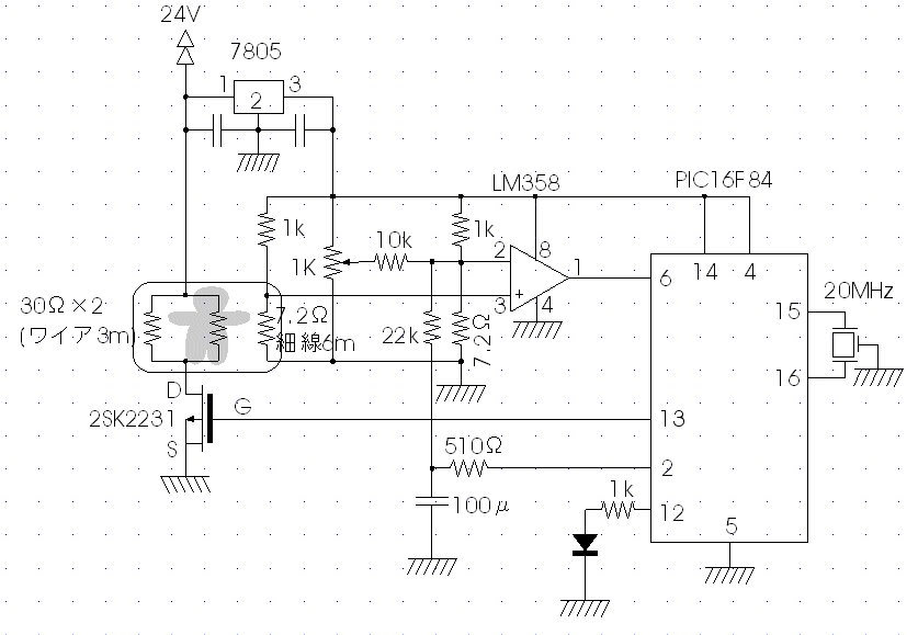 ヒーターは24ボルトで駆動し、制御系は5Vで動作しています。PICの2番ピンにPWMで設定電圧が出力されており、これが、コンデンサで平滑された、ブリッジに印加されます。 PICの12番ピンと13版ピンには同一の信号が出力され、12番ピンに接続されたLEDは、駆動状態のモニター用です。 |