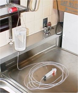 シリコンパイプにミシン糸を通す為に作成した治具で、シリンジと、イルリガートル(タッパーウエアの底にパイプを取りつけて作成)から出来ています。 イルリガートルの上部にある、赤いものが、ミシン糸です。 |