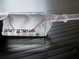 シリンジを引いて水を吸引すると、流れに沿ってミシン糸がパイプの中を進みます。 シリンジを全て引いては、シリンジからパイプを外し、シリンジの中の水を出して、再びパイプを取りつけて、繰り返します。 ミシン糸が流れやすいように、手でミシン糸のボビン持って、助けてやります。また、引っかかったときは、シリコンパイプ全体を揺すってやると、動き出します。 写真は、ミシン糸が流れて、シリンジの中までやって来たところです。 |