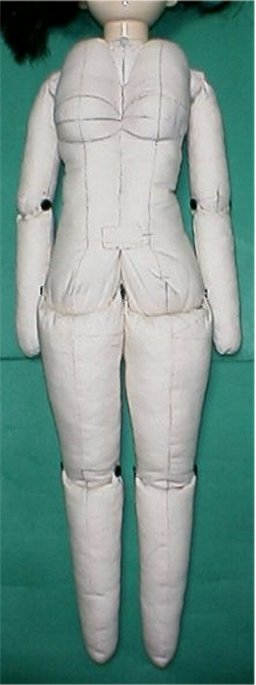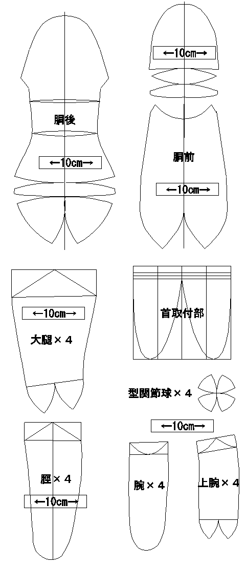 DMX91を試作することで、布製の球体関節が問題なく動作することが分かりました。 そこで、ここでは、関節球と、腕や足を一体化することで、部品点数を削減し、球体関節に由来する不自然な凹凸を減少させる方法を試してみました。 また、肩関節の構造を改善し、形状安定性と、組み立てやすさを向上させています。 さらに、胴体の型紙を工夫し、体のラインを立体的に改善しています。 |