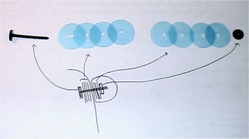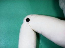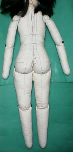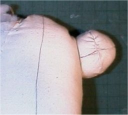 ポリプロピレンフィルムは、厚さ150ミクロンのもので、100円ショップの、クリアフォルダを直径30ミリ程度に切り抜いて作ります。 上図は、ボディー内側から差し込んだピンを、関節球を貫通して、その開口部へ導き、ポリプロピレンフィルムを4枚重ねて入れた所です。この後、肩関節球に詰綿して、縫合し、下図のようになります。 ボディーと肩関節球がよく馴染み、形態が安定している事がわかります。薄いフィルムを重ねているので、堅さも気にならず、容易に破損することもありません。 |