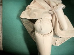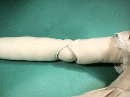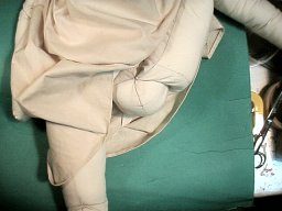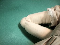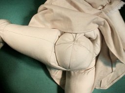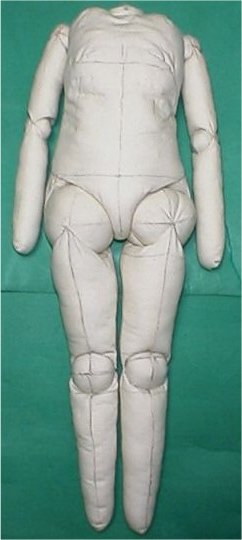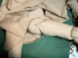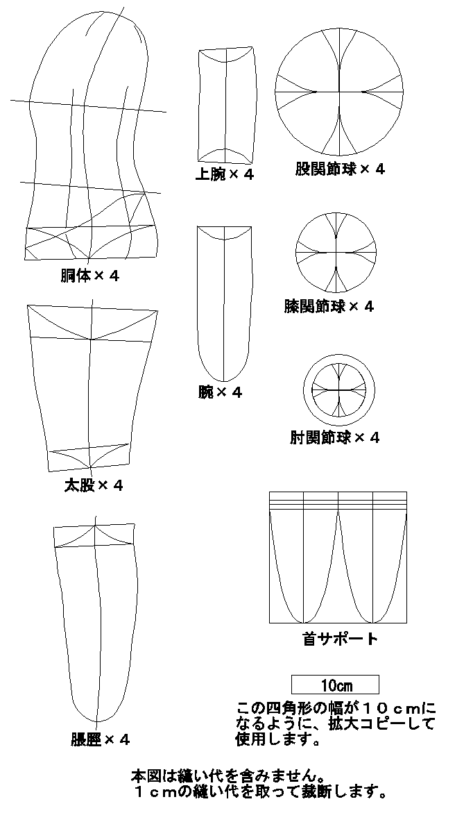 関節球を含めて、すべて布で組み立てます。試作品なので、罫書き線が残ったままです。 内部には、張力バランスを取りやすい「つぶ綿」を充填しています。これは、綿を、5ミリ程度の綿玉の集合体に加工したもので、流行のパウダービーズにあるような、流動性を綿に与えたものです。個人的には、パウダービーズよりも高く評価しています。 生地は、生成りのシーチングを使用しています。シーチングは、ブロードよりも伸びがあって、融通が利き、バリバリせずにふっくらとした風合いに仕上がりやすいです。 |
