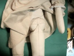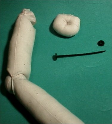 一般的な球体関節人形と同様の構造ですが、素材は綿を充填した布です。関節部に布製の球体を配置し、接合される手足を、関節球の回転軸部に縫い付けて接合しています。 体は、左右2本の大根状構造物を縫い付けて構成されています。この構造は、綿による張力がよくバランスし、型崩れを起こしにくい特徴があります。 |