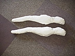 胸の部分から、股間部まで、2本の胴体を前後2箇所で縫い合わせて行きます。 |