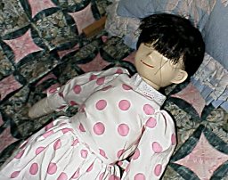 MARS氏作成の抱き人形用の首をつけて、素体は完成です。本機は、全長70センチですが、60センチ用に作ったワンピを着ているので、袖が短いです。 文化人形の伝統を踏襲する高度に文化的な手足には、手のひらも指もありません。 |