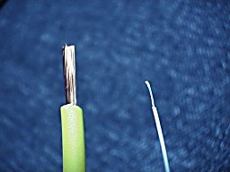 電熱線が入っている事を感じさせないようにするため、被服も含めて0.5ミリの、極細の銅撚り線をヒーターに使用しています。 横に写っている通常の電線と比べると、細さが分かります。 銅線は400ppmとステンレス線の70ppmに比べて温度による抵抗の変化が大きく、温度検出が容易です。 |