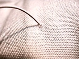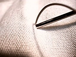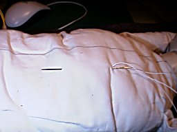 電熱線の出ている穴へ、針を差し込んで、縫い進めます。 足の先など、その場所で電熱線を固定する場合は、僅かに(0.3ミリ程度)異なる場所に針を差し込んで、すこしだけ電熱線を表面に出します。 |
