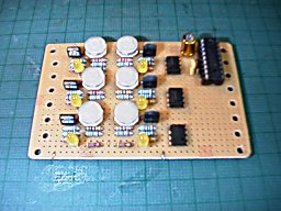 パワーMOSFETとPIC16F84で製作した部品点数の少ない制御基板です。 白い部品が半固定抵抗器で、ブリッジのバランスを調整して、各セグメントの温度を設定します。 |