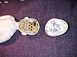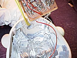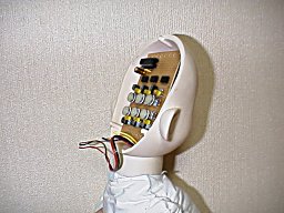 頭蓋後部にも電熱線を配線しているので、これを接続します。 この状態で常温で電源を投入し、ブリッジのバランスを取ります。その後、一定電圧のオフセットを与えると、その電圧に見合うだけ、体温が上昇します。 6つのLEDがヒーターのドライブに応じてそれぞれ、不規則に点滅して、如何にも「サイバー」って感じです。 |