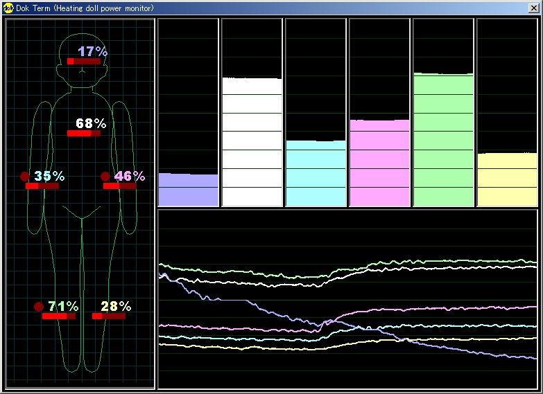 PICからRS232C信号を受信し、各ヒーターのドライブ状況を監視、記録するソフトです。 上の図では、グラフ中央部で体位が変化し、ヒーターのドライブ率が変化しています。また、頭部は次第に温度が上昇し、ドライブ率が終始下降しています。 ドライブ率は、三角窓関数と畳み込みして、プロットしています。 |