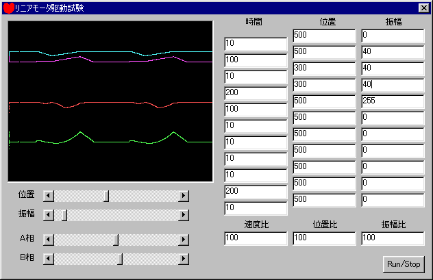 パラレルポートを制御して、2相の駆動信号を出力するソフトです。 ピストンの位置と信号振幅を各時間について指定すると、各点を直線補完して信号を生成します。 グラフの上の各線は、 水色:ピストンの位置 紫 :印加電圧 赤 :A相信号 緑 :B相信号 を表します。 |
