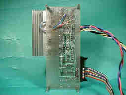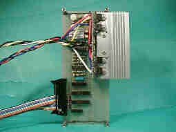 基盤の下部はデジタル部、中央部がD/A変換部、上部がアナログ部です。基盤の右側には、放熱板のある電力増幅器が見えます。 熱設計をしていないので、駆動信号によっては、放熱板が過熱します。大きなものと交換するか、強制空冷の必要があります。 基盤下部に接続されたリボンケーブルは、PCのパラレルポートとのインターフェイスです。 D/A変換器は、R−2Rの梯子型抵抗網を使用した古風な設計です。 |