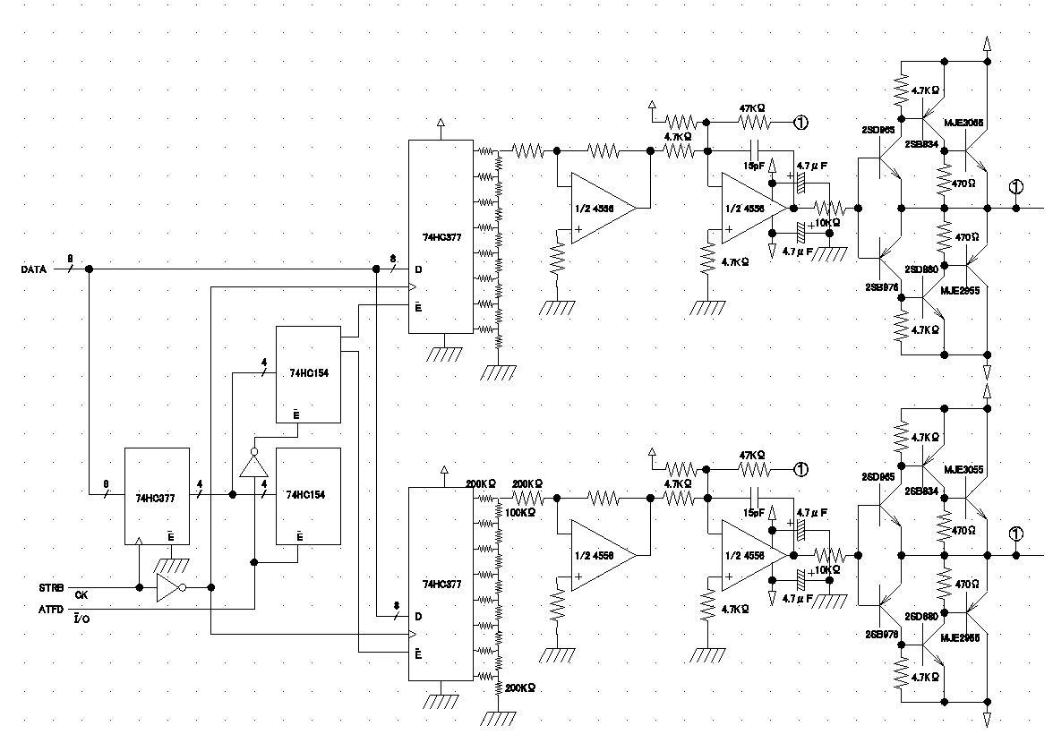 デジタル部は主に基盤の裏にテフロン線で配線しています。 ストローブの立下りでアドレスを、立ち上りでデータをラッチする方法で、最大256バイト個までのポートを使用できます。今回はこの中から、2バイトを使用しています。 |