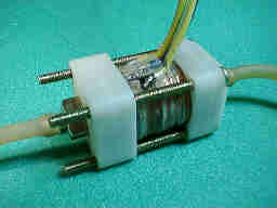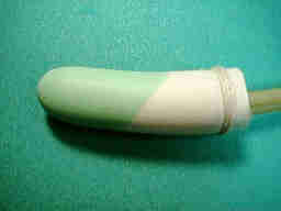 台所用のゴム手袋の指の中に綿を詰めたものです。動脈は指の先まで挿入されており、静脈は指の付け根に接続されています。 動脈から送りこまれた温水は、綿の中を通って、静脈から回収されます。 |
