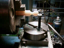 フライス用に作った回転テーブルを、旋盤の往復台に取りつけます。 材料の軸と、回転テーブルの回転軸をピッタリ合わせて、回転台を動かすと、面白いように球が削れます。 |