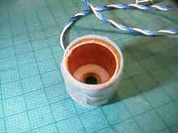 コイルに電線をはんだ付けして、熱収縮チューブで固定しています。このチューブは前後のフランジプレートを固定するのにも使われています。 |