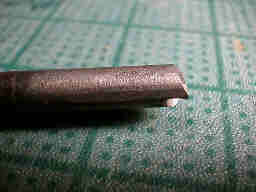 刃長30ミリ、直径3ミリのエンドミルです。ロングタイプですが、首の部分が丸棒なので、剛性はかなりあります。 焼き入れは先端のみ行っています。相手がプラスティックですから、焼戻しはしていません。この方が切れ味が長持ちします。 |