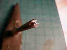 細い丸ヤスリ(実は、ダイアモンド糸鋸の歯)で2方向から溝加工して、刃を作り、あとは、円周と底面に逃げ角を付けます。 MDXの切削は、主に横方向に進むので、底刃より、側刃の切れ味が重要です。ですから、側刃には大きなスクイ角(プラスティック相手ですから思いきって付けて大丈夫です)をつけて、綺麗に研ぎ上げます。 |