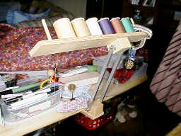 板切れに穴をあけて、6ミリの丸棒を接着して、糸立てとしています。板切れ、丸棒共に、ホームセンターで買ってきたものを、切断しただけで、簡単に加工できます。 |