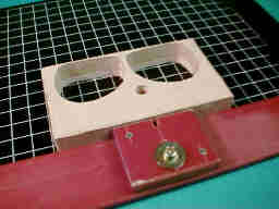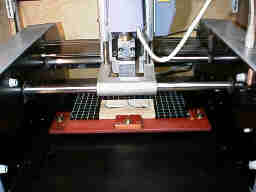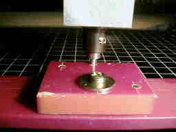 治具をモデラに取りつけたところです。ワークプレート手前の茶色い部分が治具です。 |