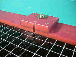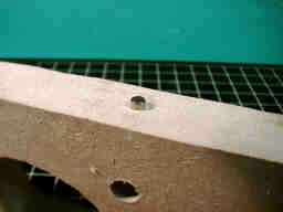 材料の手前面、中央付近には3ミリの穴をあけ、直径3ミリの短い平行ピンを挿入します。材料はこのピンを中心に反転させます。 因みにこの材料はMars氏が持ちこんできたパーティクルボードで、価格が安いのは良いのですが、ぼそぼそで、削ると毛羽立って、よろしくありません。 |