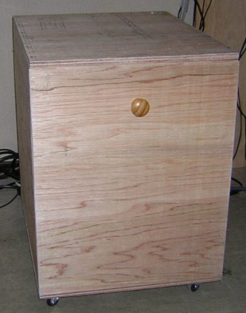 | 安価なコンクリートパネルで組み立てているので、ご覧の通りサモシイ外見です。移動が楽にできるように底部にキャスタを付けています。 手前の板は上下2箇所のローラーキャッチで固定されており、ノブを引っ張るとポコンと手前に外れます。兆番で開くより、この方が保守が容易です。 |