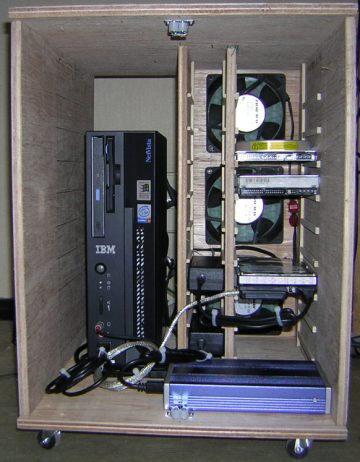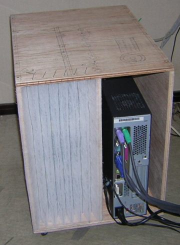 | 手前の板を外すと内部にアクセスできます。左側にNetvistaが、中央にハードディスクアダプタ用の電源、右側にハードディスクを格納します。 ハードディスクは9台まで格納可能で、IDE−USB変換ケーブル(1900円也)を用いてPCと接続されています。 現状では2台のみがPCと接続されていますが、Netvistaには6つのUSBポートがあるので、6台までは追加のハブなしで接続が可能です。 ハードディスクとその電源の側面には、スポンジ付きの「すきまテープ」(ドアの隙間に張ってすきま風を防止するもの)を貼り付けて、しっくりとケースに嵌め込みます。この方法なら、簡単・安価でハードディスクに与える機械的ストレスも僅かです。 | |