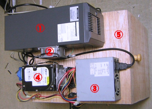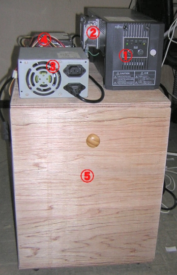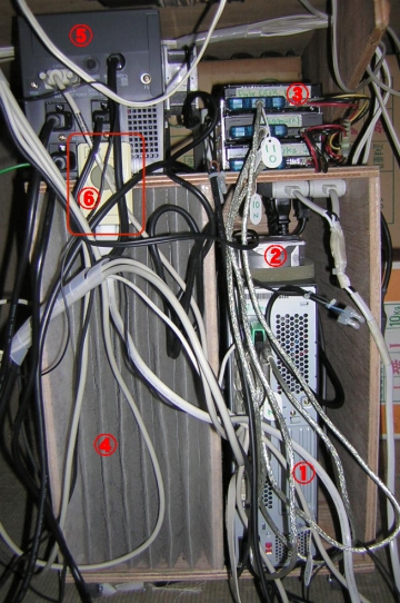 (1)富士電機製無停電電源装置 (2)無停電電源装置に増設された冷却ファン (3)ケース外ハードディスク用電源装置 (4)ケース外ハードディスク (5)本体ケース 本来であれば、無停電電源装置も含めてケース内に格納し、 フィルタを通した空気で冷却したかったのですが、当初の 見込みが甘く、上部に設置する結果となっています。 |