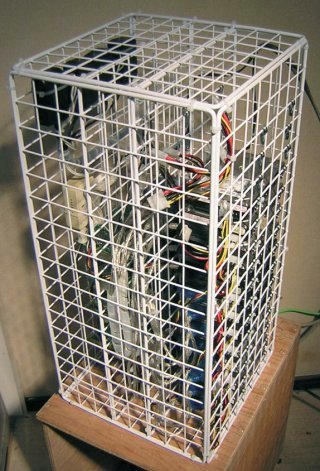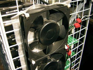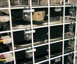 | ハードディスクに風を吹き当てるように、結束バンドで 固定しています。メッシュとファンの間にフィルターを 挟み込んでいます。 | |