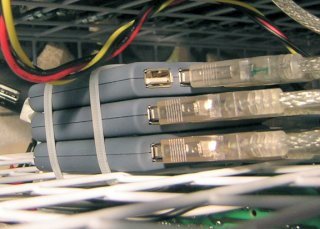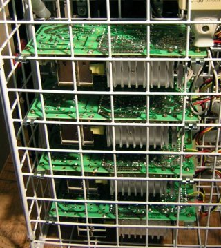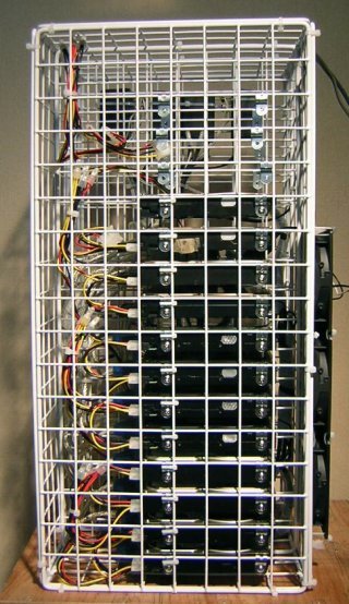 | 左側には電源を格納しています。電源はコンフィデンス 2000と言うディスクアレイに搭載されていた中古品 (2出力:12V/5V)を4台使用して、16台の ハードディスクに給電しています。電源もF型サドルを使うと 簡単に取り付けられます。 | |