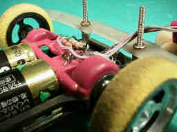 反射式フォトセンサをフロントシャフトの上部に組み込み、シャフトが6角形である事を利用して、車軸の回転に応じたパルスを得ています。 このパルスでCPUに割り込みを掛け、走行距離カウンタをインクリメントさせます。 |