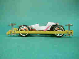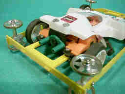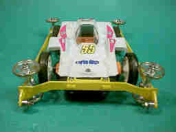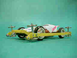 縦構造リングバンパーに抵抗の少ない19ミリのベアリングを装着したマシンです。 縦構造バンパーは、フェンスとの衝突の衝撃を変形して吸収する為、ローラー軸受けや、シャーシが受けるショックが大幅に軽減されます。 加えて、、ローラーを傾ける力に対しては、どの方向に対しても、高い剛性を持っており、リフトイン、リフトアウト、及び、ダウンスラストの変化等も殆どありません。 つまり、縦構造リングバンパーは、柔にして剛な特性を持っており、これにより、静かで安定した走行が可能です。加えて、衝撃の少なさにより、ローラーやシャシ等の、メカトラブルも少なく、耐久レース向きのバンパーと言えます。 しかし、構造上大径ローラーを取り付けて105ミリレギュレーションのマシンを構成しにくく、従来は9ミリのベアリングローラーを使用していました。 この9ミリのベアリングローラーは小さくて、配置自由度が高く、耐久性にも優れるので、使いやすいのですが、直径が小さい事と、回転抵抗が大きい事により、速度的には、大径ローラーには、及びません。 本車は、いくつかの工夫により、縦構造リングバンパーに19ミリのベアリングローラーを取り付けて、速度向上を試みた試作車です。 |