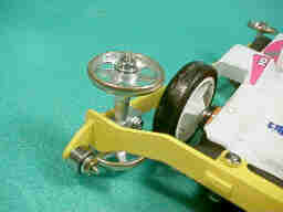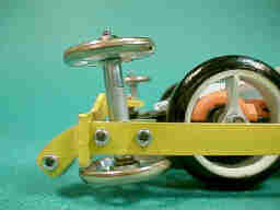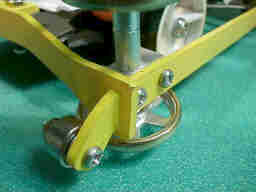 通常、リングバンパーでは、タイヤのサイドにローラーを配置する事によって、スタビライザローラーを使用する事なく、ローラーと地面との接触を避けています。 しかし、本車では、ローラーの直径が19ミリと大きく、上の様に、タイヤのサイドにローラーを配置する事が出来ません。 |