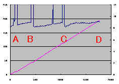 左のグラフはレースでの走行ラップをラップタイム計測記録システムを使用して記録したものです。B点とC点がマシンを交換した点です。 青線がラップタイム、紫線がラップ回数です。電池が消耗して速度が落ちる分だけ早いマシンを投入して、速度を一定に保っています。 | |||