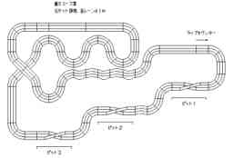 左が本レースのコースで、Dr.BUZZの設計による見事なものです。 ブリッジチェンジャーがありますので、スピードを上げるとコースアウト等のトラブルが発生しやすく、遅いとラップ数が伸びません。そこで、出来るだけ一定の早さで走る事を目指しています。 ところが、アルカリ電池は@最初は電圧が高くA次に電圧が徐々に下がる安定期に入りB次第に電圧の低下速度が増す、と言う特徴があります。 この為、最初電圧の高い時点で安定走行するマシンは、終盤では遅すぎ、終盤で安定走行するマシンは最初は早すぎてコースアウトする事になります。 | |||