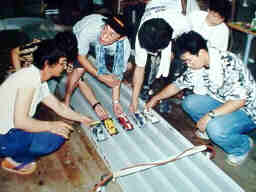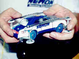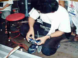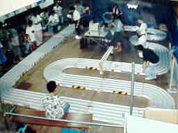 99年8月28日にミニ四天国(本店)のサマーフェスティバルの一環として行われた耐久レースです。 とにかく「フェスティバル」ですから、「思いっきり楽しもう」と言う事で、総統発令の「黎明計画」に従ってマシンを準備、揃えのユニフォームで鳴り物入りで参加しました。 ![]() やはり、5レーンコースは難しいです。とにかく硬いので、段差や継ぎ目で受けるショックが強烈です。 加えて、5レーンコースはJCJCの内側に1レーン、外側に1レーン増設した感じのコースなので、特に、S字では、緩い外周部で加速したマシンが、最内周のキツイコーナーに飛び込むとき姿勢を崩し易いです。 我々のチームも、JCJCや狼のコースでセッティングを出していたので、持ち込んだマシンはテスト走行でコースアウト続出、冷や汗を流してセッティングを変更しました。 しかし、他チームの、バランスの良いマシンは、S字でも飛び出す事なく、安定して走行していました。 今回も5名のチームで出場、電池交換、ラップ計測、充放電管理、記録、マシン整備、と分業体制で臨みました とにかく大好きなミニ四駆を2時間も走らせ続けられたので、たまらなく満足出来ました。通常のスプリントレースなら、走っても高々30秒程度ですから、一年分くらい楽しんだ気分です。 |
