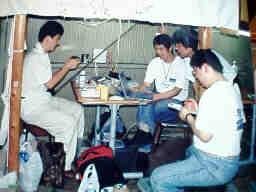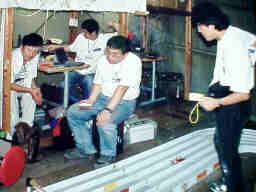 レース中の作業は緊張からミスが発生し易いです。これを防ぐ為、右のメンバが読み上げるチェックリストに従って、左のピット担当が作業を進めます。 覗き込んでいるのが、電池交換担当、その奥(中央)が充放電担当です。 明確な役割分担とチームワークが耐久レースの肝になります。 |