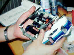 コースを走らせてみて、セッティングを煮詰めます。今回は衝撃でコースアウトし易い為、前後のローラーをストレートバンパーで接続し、ローラーの上下間隔を広げています。 また、安全の為にギア比も当初の2.2:1から、2.5:1にアップし、速度を2.4秒/JCから、2.6秒/JCに落としています。 |