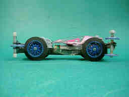 シャーシ本来のダウンスラストでは、きつすぎるので、ステーを設けてネジで締める事で、ダウンスラストを可変とし、2度に調節しています。