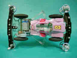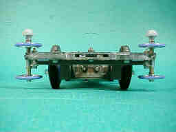 リアには4輪のローラーを設定しています。シャーシにブレーキ付きリアローラースティを取付け、これに、弓形バンパーを切り張りして105ミリ巾となる様に19ミリプラリングローラーを取り付けています。