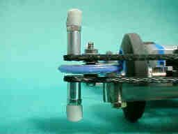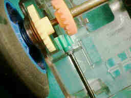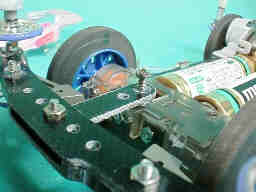 FMシャーシはプロペラシャフトが2ミリと太いので、軸受けの摩擦が馬鹿になりません。そこで、1.4ミリのSuper1用のプロペラシャフトを使用して、軸受け部分には、内径1.5ミリ、外径2ミリのフランジ付きカラーを挿入して軸受けとしています。カラーはテフロン製で摩擦は僅かです。