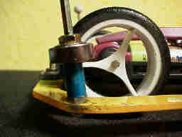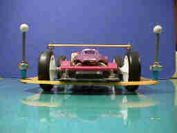 バンパーの後部は、リアローラーステーを取り付ける一般的な方法で取り付けています。ローラーの高さは10mmと40mmと上ローラーの位置を高くして、安定度を高めています。強度が不足する為、重心が高くなりますが、ローラの上端に、FRPのバーを渡しています。
