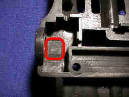 シャーシも殆ど無加工ですが、図に赤色で示している、前輪ギアボックスの一部はギアと接触する場合がありますから、削り込みます。但し、新しいシャーシでは金型が修正されて、この加工は必要ありません。
