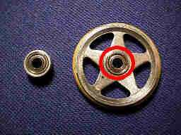 ベアリングローラーの中心の赤丸部分を削り出してベアリングとして使用しています。完全に芯の出た形で削り出す素晴らしいテクニックを開発したのですが、620ベアリングがAOパーツで出ましたので、今は必要のない加工となってしまいました。とは言え、外径を6mmとするより、6.05mmくらいにした方が、超速ギアにしっくり入るので、この面では今後も活用出来る技術です。