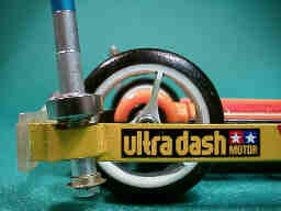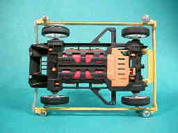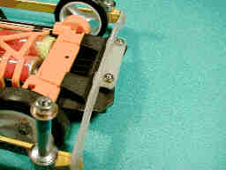バンパーとローラーの間隔が大きくなると、ローラーの支持剛性が低下するので、バンパーの位置を、ホイルに接触する寸前まで後退させています。このため、フロントバンパーは、シャーシのバンパー取り付け穴より後ろにあります。 この結果、フロントバンパーから、前向けにステーを出して、シャーシに上からネジ止めしています。 |