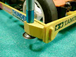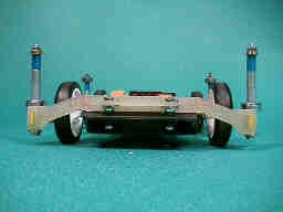 フロントバンパーの取り付け穴がバンパーより前にある為に、バンパーがシャーシの上を跨ぐ構造になっています。 フロントローラーポールの先端には、スタピライザーポールの玉(通称スタビ玉)の代わりに、9ミリベアリングのブッシュを付けています。滑りに方向性があり、この為、ブリッジでの安定性が向上します。 |