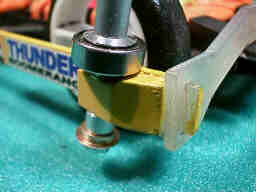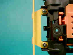 ローラー取り付けステーの上下面を斜めに削って、ダウンスラストを得ています。角度は8度です。 下端に取り付けた真鍮パーツは、9ミリベアリングローラーの取り付けブッシュで、ブリッジチェンジャーの着地時にフェンスと接触します。 |